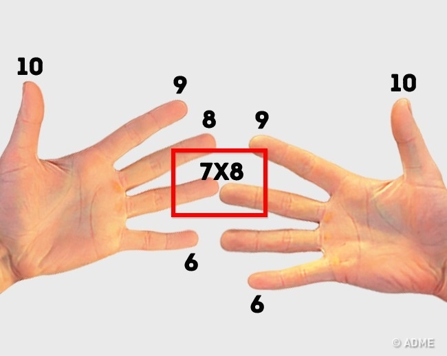 Поверніть руки долонями до себе і пронумеруйте кожен палець, починаючи з мізинця, від 6 до 10. Тепер, щоб, наприклад, помножити 7 на 8, з'єднайте палець № 7 на лівій руці з пальцем № 8 на правій. Кількість пальців внизу, вважаючи разом із з'єднаними, позначає десятки (у нас їх було 5). А пальці, розташовані вгорі, потрібно перемножити між собою — вони позначають одиниці (в нашому випадку множимо 3 на 2). Відповідь: 7×8 = 56.