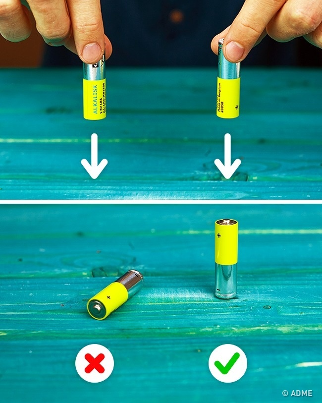 Відрізнити хорошу батарейку від поганої дуже просто. Підніміть дві батарейки на 1-2 см над столом і відпустіть. Та батарейка, яка відскочить і впаде, розряджена.