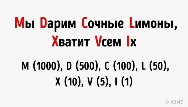 Для запам'ятовування римських цифр і чисел можна використовувати таку фразу: Ми Dарим Зочні Lимоны, Хватит Vсем Iх. Перші букви в словах означають римські цифри за спаданням: M (1000), D (500), C (100), L (50), X (10), V (5), I (1).