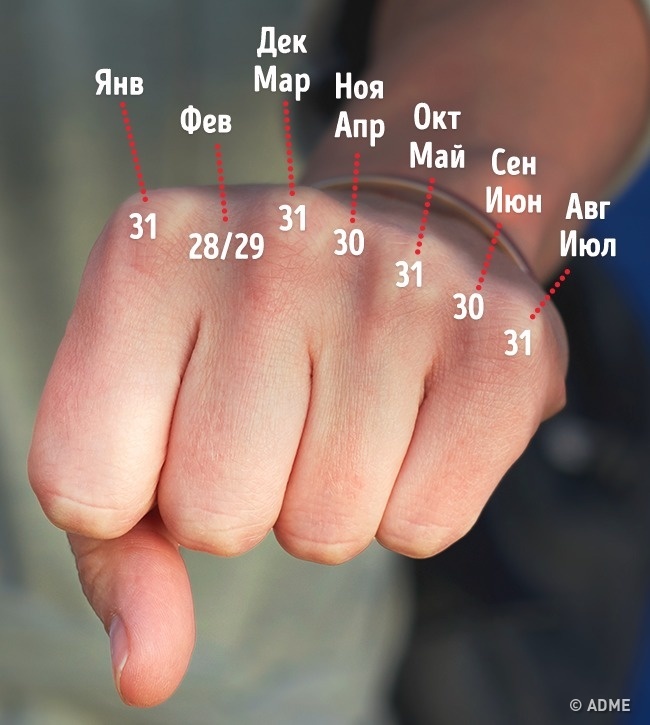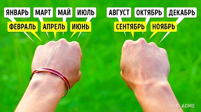 Стисніть руку в кулак і почніть рахувати місяці по кісточках пальців. Кожна кісточка і западина — це окремий місяць. Якщо ви вважаєте по одній руці, то, дійшовши до кінця, знову починайте з кісточки вказівного пальця.