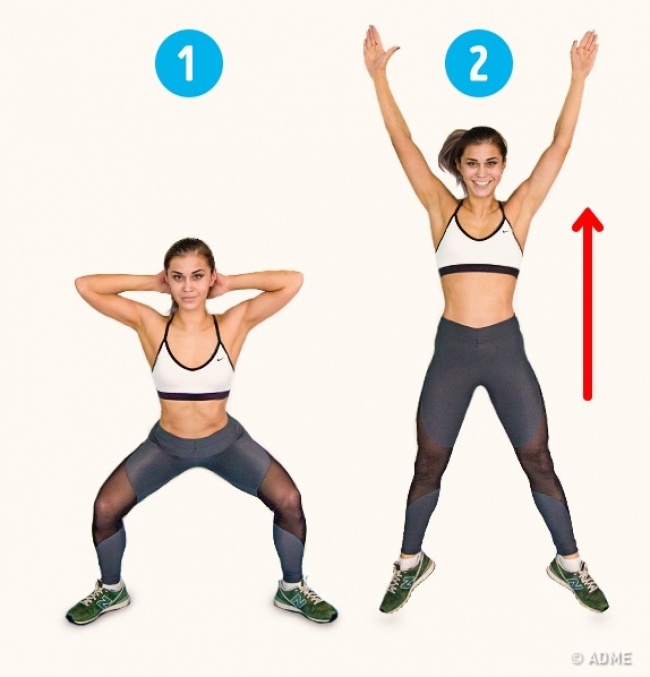 Як робити: Поставте ноги трохи ширше плечей, зігніть їх в колінах, руки покладіть на потилицю. Потім з силою випригніте вгору, викинувши руки і ноги в повітрі «зірочкою». Приземлитеся і знову прийміть початкове положення.