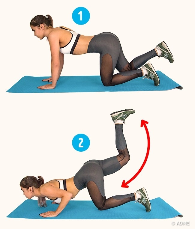 Як робити: Упріться руками в підлогу і прийміть те ж положення, що і при віджиманнях. Потім зігніть і піднесіть коліно правої ноги до живота. Далі випряміть цю ногу і відірвіть від підлоги вгору на 13-20 див. Повторіть для лівої ноги.
