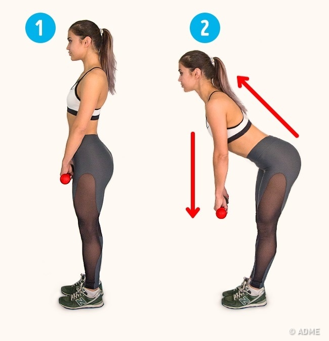 Як робити: Встаньте прямо, візьміть в руки 2 гантелі, ноги на ширині плечей. Починайте повільно нахилятися вперед з прямою спиною, руки вільно звисають вниз. Нахиляйтеся так низько, наскільки зможете. Потім повільно поверніться у вихідне положення.