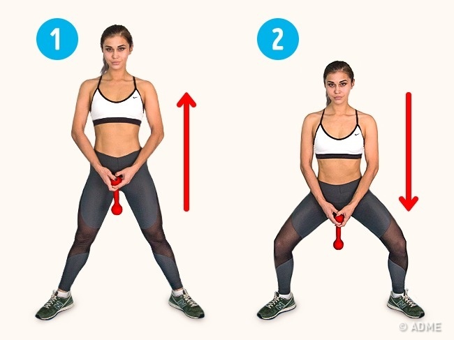 Як робити: Візьміть одну гантель або гирю в руки, встаньте прямо, ноги на ширині плечей. Вдихаючи, почніть повільно опускатися, згинаючи коліна. Опускайтеся до тих пір, поки стегна не будуть паралельні підлозі. Потім з видихом піднімайтеся.