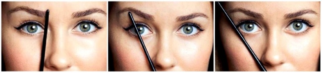 Щоб визначити, де брову починається і закінчується, в якому місці має бути вигин, згадайте про старий добрий трюк. Прикладіть олівець до краю носа і розташуйте його паралельно носі ― тут брову починається. Нахиліть олівець, щоб він проходив через зіницю, ― в цій точці буде вигин. Розташуйте олівець так, щоб він з'єднав край носа і зовнішній куточок ока, ― це буде край брови.