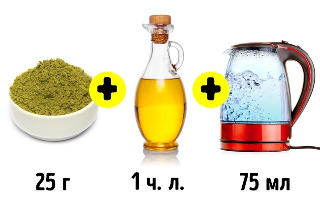 - Залийте хну окропом у пропорції 1:3, додайте оливкову олію, ретельно перемішайте.