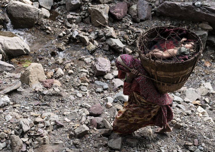10. Жінка з кочового непальського народу рауті несе сплячої дитини
