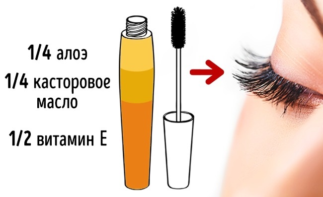 Не викидайте старий контейнер від туші. Вимийте його і змішайте в ньому касторове масло, вітамін Е і сік алое. Щіточкою від туші зручно наносити суміш на вії і брови. Робіть це кожен вечір перед сном протягом місяця.