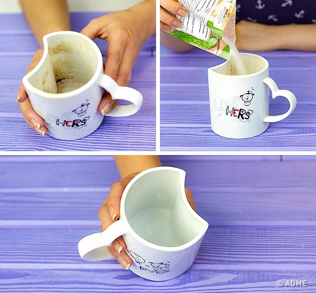 Результат: В саму брудну чашку, яку ми тільки змогли відшукати у редакції, ми насипали трохи лимонної кислоти, почистили губкою і сполоснули водою. Вуаля — бруду як не бувало!