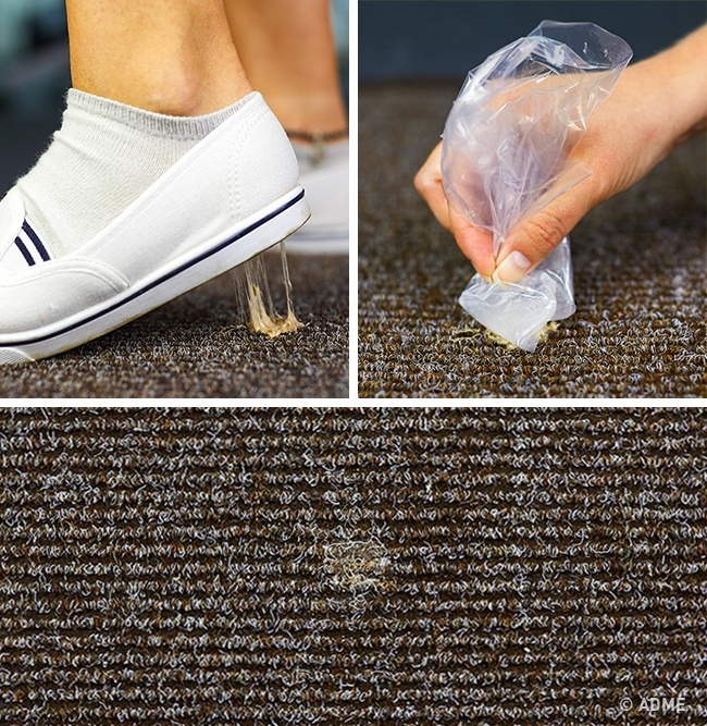 Результат: Легенди свідчать, що відліпити жуйку допоможе заморожування: приміром, досить прикласти до жуйці лід, і від неї не залишиться навіть сліду. Але на ділі виявилося, що чим рельєфніше поверхню, тим складніше видалити залишки жуйки: на пам'ять про експерименті на килимі залишився невеликий слід, позбутися якого ми так і не змогли.