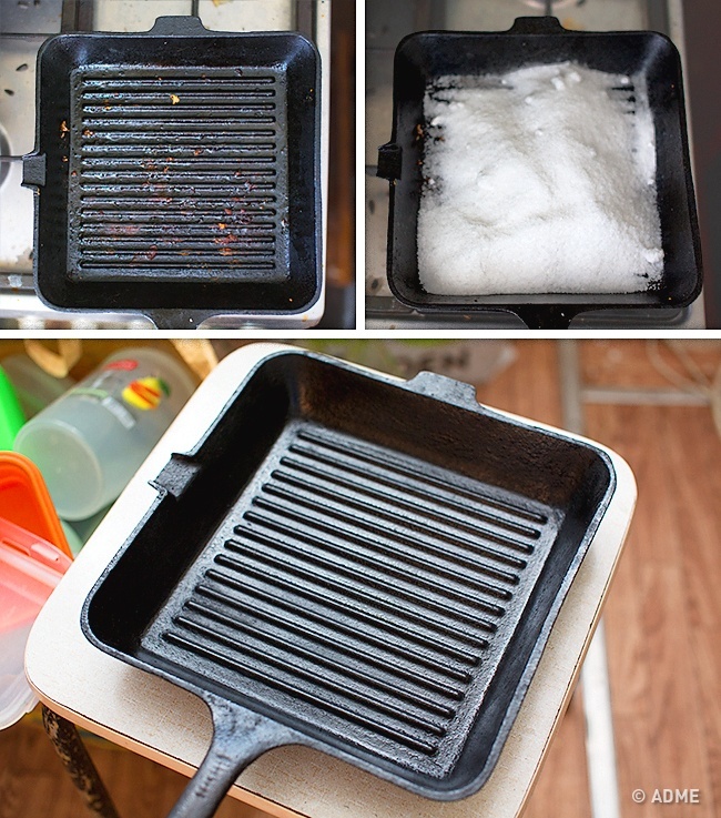 Результат: Ми вирішили перестрахуватися і додали побільше солі, залишивши її на 15 хвилин. Довелося добряче поорудовать щіткою, але в цілому сковорода очистилася непогано.