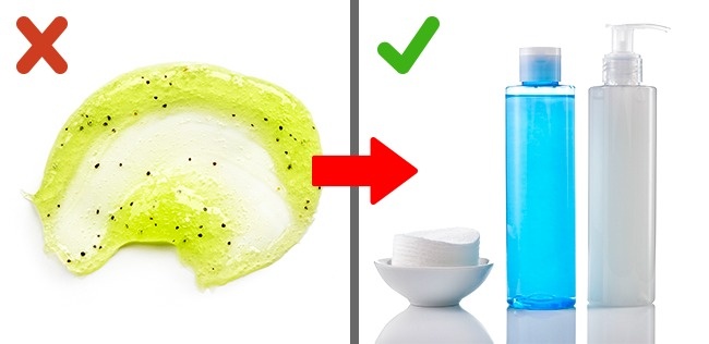 Замість скрабу, який може травмувати верхній шар епідермісу, використовуйте засоби з кислотами, які м'яко позбавлять від бруду і старих клітин.