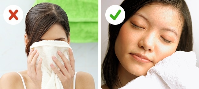 Після вмивання не варто енергійно розтирати обличчя рушником, це може призвести до лущення шкіри. Просто легко промокніть і залиште висихати. Використовуйте персональне рушник, яким витираєте тільки особа, а не все тіло.
