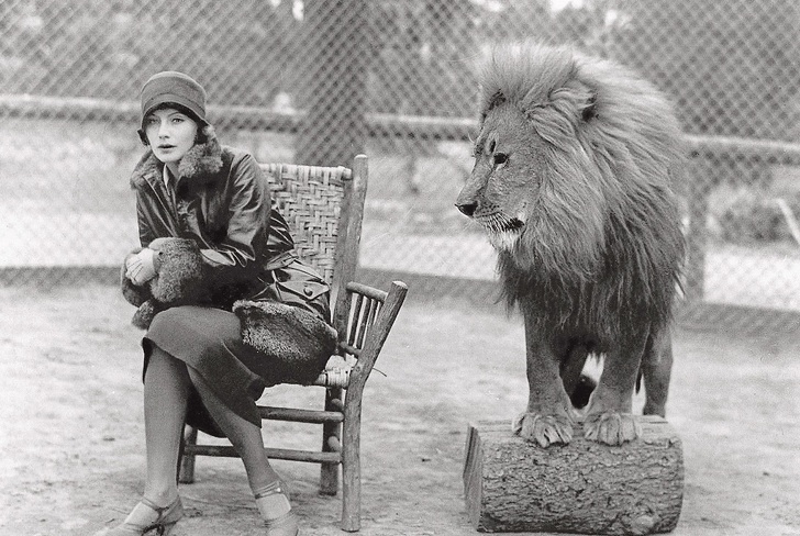 Не зовсім закадрове фото, але теж дуже цікаве: актриса Грета Гарбо і легендарний лев з логотипу студії Metro-Goldwyn-Mayer