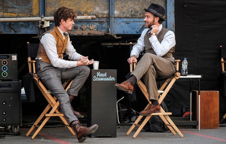 Едді Редмейн і Джуд Лоу розмовляють на знімальному майданчику «Злочинів Грін-де-Вальда»