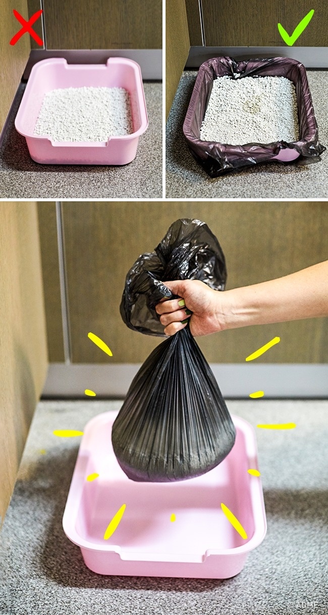 № 1. Натягніть сміттєвий пакет на котячий лоток і засипте наповнювач. Прибирання лотка стане легше