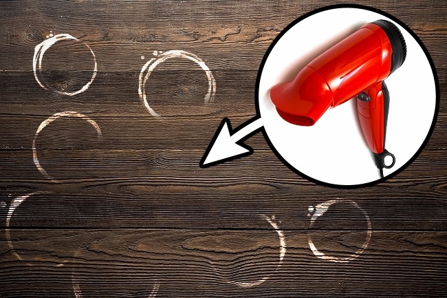 Білі плями від води на дереві можна «висушити» звичайним феном, а потім змастити поверхню невеликою кількістю масла, щоб зволожити