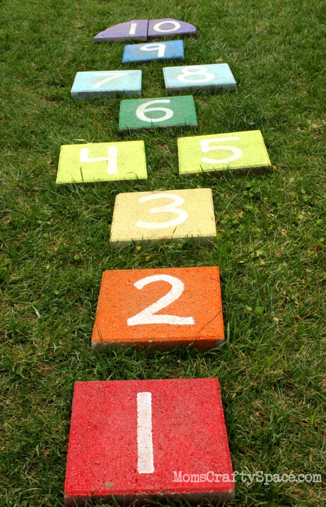 Прекрасна ідея для дітей — переносні класики. Для них знадобиться тротуарна плитка і різнокольорові фарби. Діти точно будуть раді такій грі.