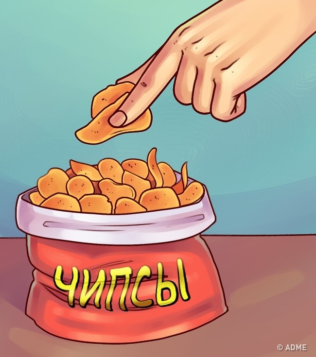 Простий спосіб, щоб було зручно їсти чіпси: відкрийте пачку і підгинають упаковку знизу, підштовхуючи чіпси вгору. Тоді не доведеться залазити руками глибоко в упаковку, і вони залишаться чистими, а саму пачку можна буде поставити на стіл.