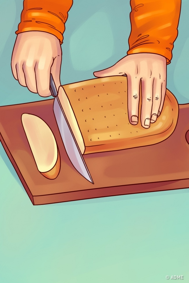 Щоб при нарізці хліб не сильно кришився, допоможе простий трюк: покладіть хліб на дошку «лицьовій» стороною вниз.