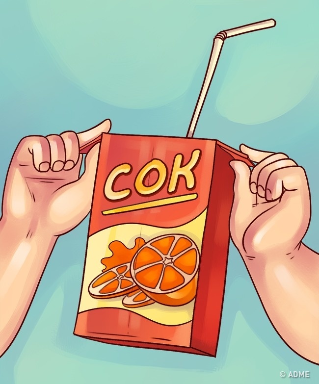 Щоб сік не виливався на дитину, відігніть верхні куточки і скажіть, щоб він тримав коробку за них. Вуаля — жага переможена, а одяг не залита соком.