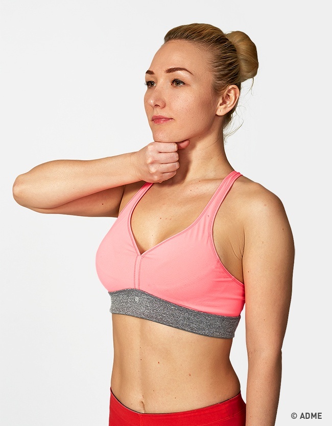 Стисніть долоню в кулак і піднесіть до підборіддя. Створіть опір і тисніть на кулак підборіддям. 5 секунд тиску, 5 — розслаблення. Повторіть 2-3 рази.