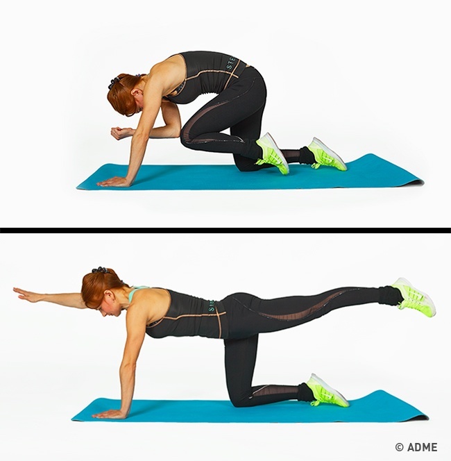 Як робити: Встаньте на карачки. Витягніть ліву ногу і праву руку в одну пряму лінію. Потім повільно зігніть їх і торкніться правим ліктем лівого коліна. Знову випрямляються. Те ж саме виконайте з правою ногою і лівою рукою.