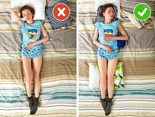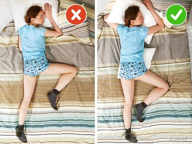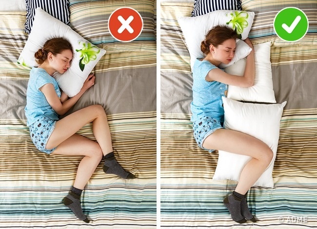 Щоб зберігати спину рівною в положенні на боці, покладіть невелику тверду подушку між ніг. Це також знизить навантаження з суглобів. А під голову — велику і пухку.