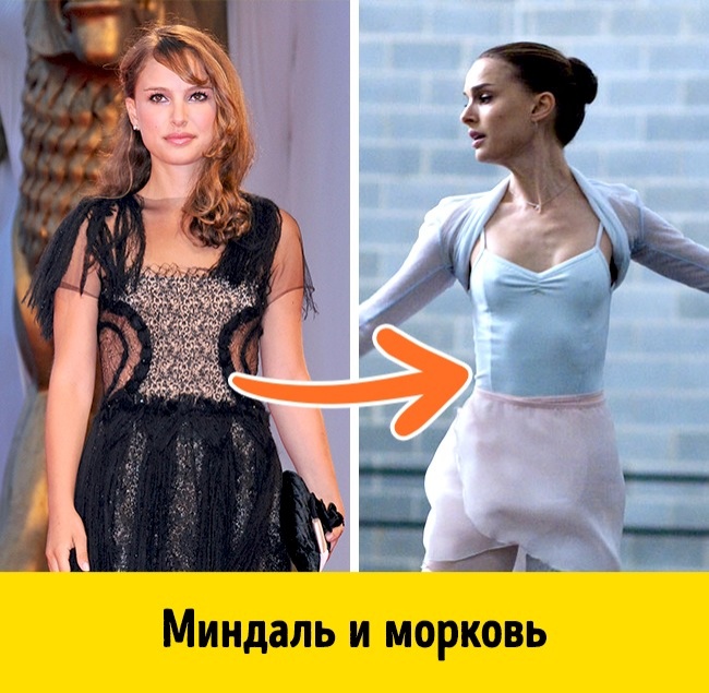 Для ролі балерини, не страждає від зайвої ваги, Портман довелося знизити свою вагу майже до 40 кг. Дієта не надто відрізнялася від живлення її героїні: половинка грейпфрута, моркву і мигдаль. Але убогий раціон і посилені тренування не така вже й велика плата за «Оскар», адже так?