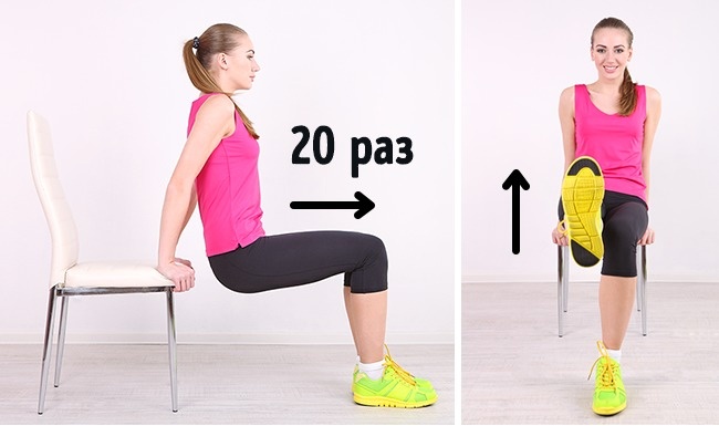 - Сядьте на край стільця: коліна зігнуті, долоні на стільці позаду вас.