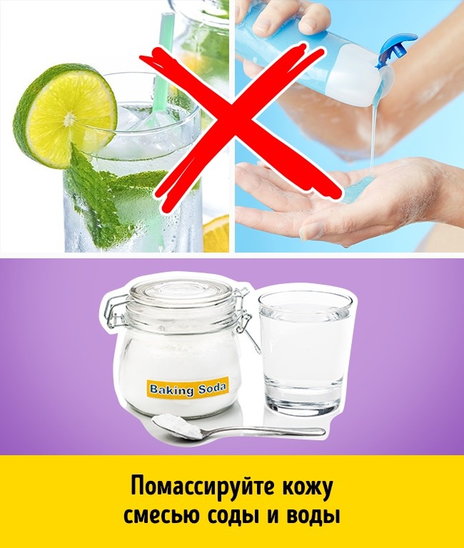 - Змішайте харчову соду з водою і протягом 30 секунд масажуйте шкіру отриманої кашкою, потім змийте теплою водою.
