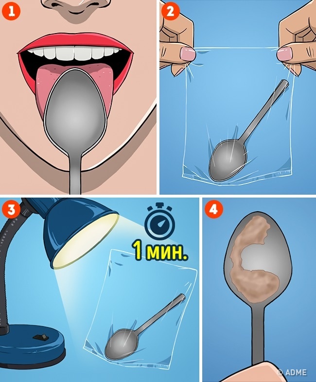 - Візьміть звичайну ложку і проведіть нею по всій поверхні язика, рясно змочивши слиною.