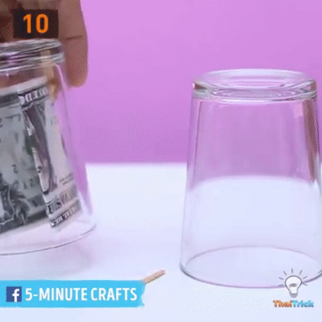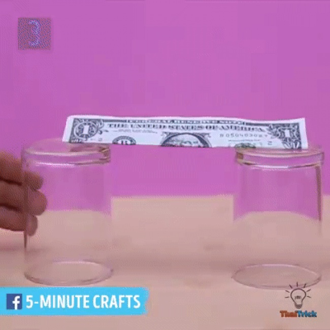 Поставте дві склянки на стіл догори дном. Покладіть на них зверху купюру. Укладіть з товаришем парі: купюру забирає той, хто зможе не впустити її після того, як один із склянок переміститься.