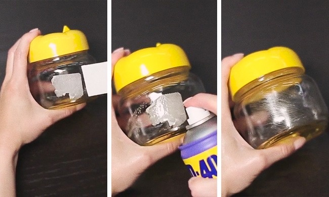 Навряд чи можна знайти людину, яку б не дратували сліди від етикеток, що залишилися на посуді. А видалити їх дуже легко — потрібно тільки нанести на «липучку» WD-40, а потім потерти губкою для посуду. Після цього залишиться тільки як слід вимити очищену поверхню.