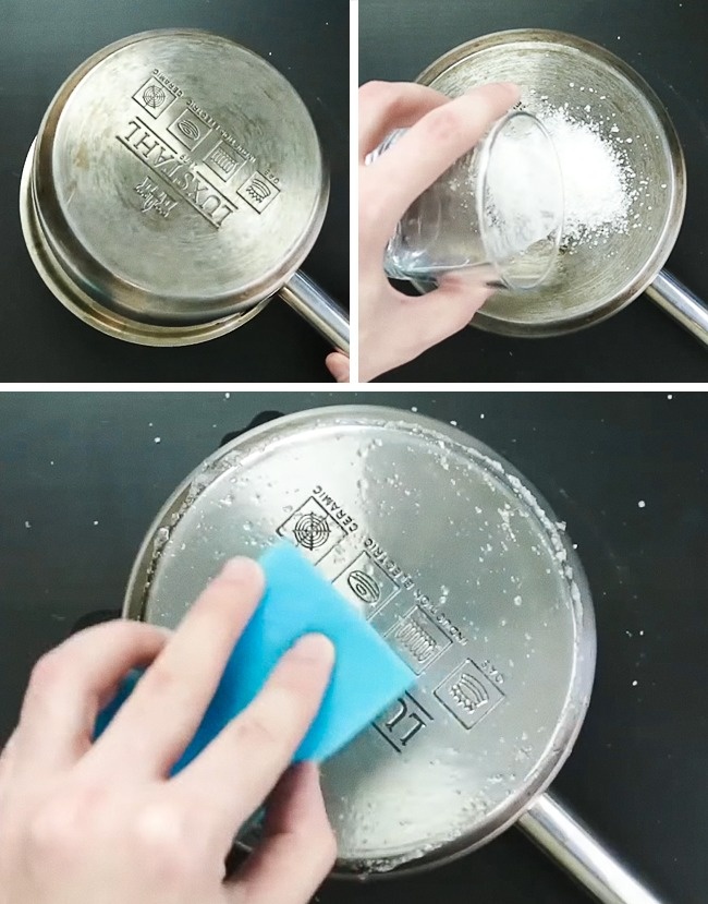 Навіть при правильному догляді на посуді з нержавіючої сталі утворюються темні плями. Прибрати їх нескладно: для початку треба насипати на поверхню крупної солі, а потім додати 9%-го оцту. Залишиться тільки потерти як слід губкою для посуду — і каструлі зі сковорідками будуть як новенькі.