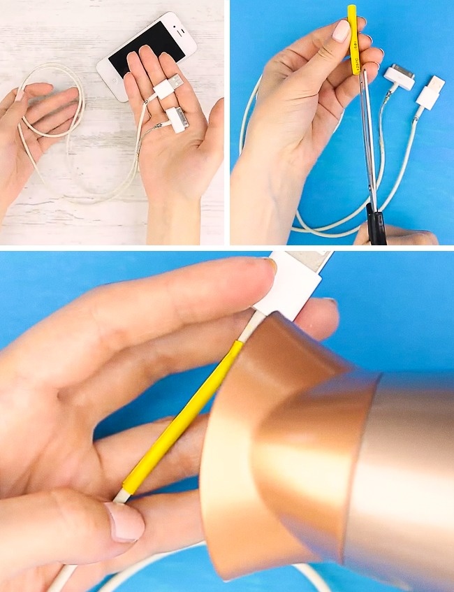 Тонкі дроти зарядних пристроїв перетираються практично завжди і у всіх. Щоб ізолювати місце перегину, потрібно взяти шматок термоусадочної трубки, розрізати його і надягти на провід. Потім нагріти трубку феном, поки вона не стиснеться до розміру дроти.