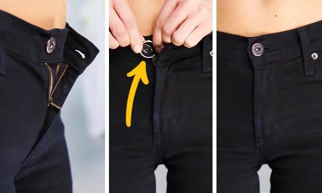 Всі знають, що блискавка на джинсах мають властивість постійно розстібатися. Щоб такого не траплялося, потрібно просто вставити в бігунок кільце для ключів і надіти його на гудзик. Після того як джинси застегнутся, колечка не буде видно.
