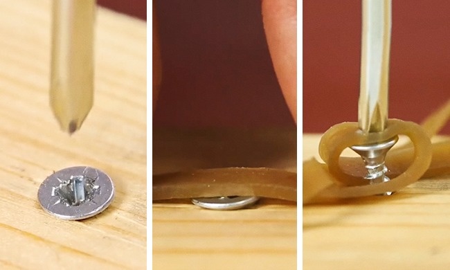 Викрутити гвинт з зірваним шліцом допоможе гумова стрічка. Її необхідно покласти на голівку саморіза або надіти на викрутку, а потім повільно викрутити непотрібний кріплення.
