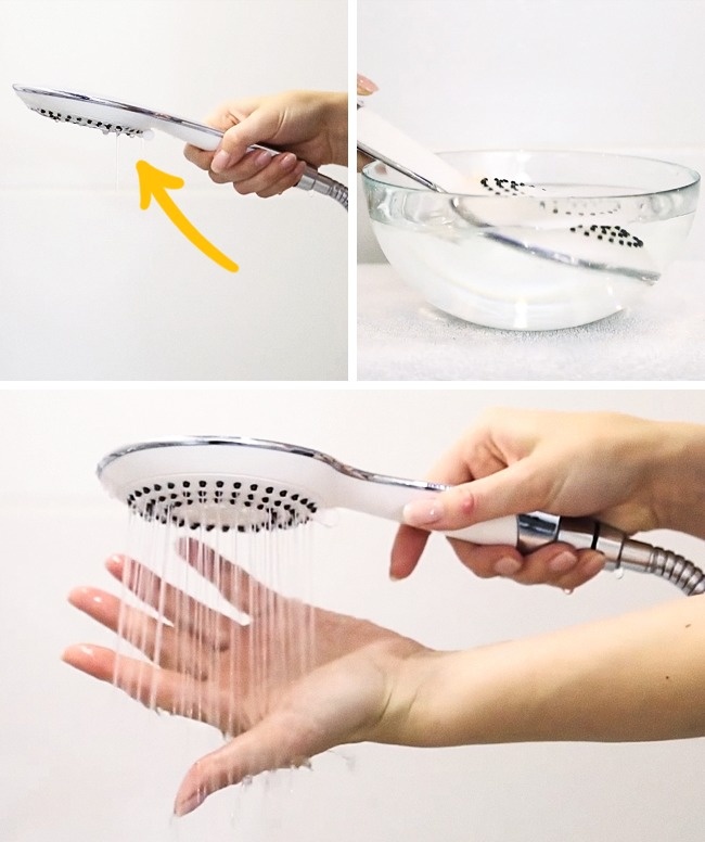 Якщо вода перестала текти з душової лійки, то, швидше за все, отвори в ній запечатав вапняний наліт. Усунути його можна за допомогою 9%-го оцту, в ємність з яким потрібно вставити лійку на 2 години.