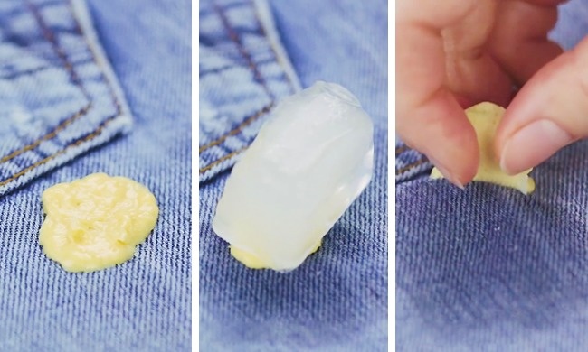 Жуйку, прилиплу до джинсів, видалити дуже просто. Для цього потрібно взяти кубик льоду і потримати його на жувальній гумці до тих пір, поки вона не стане твердою. Після цього жуйка легко відійде від тканини.