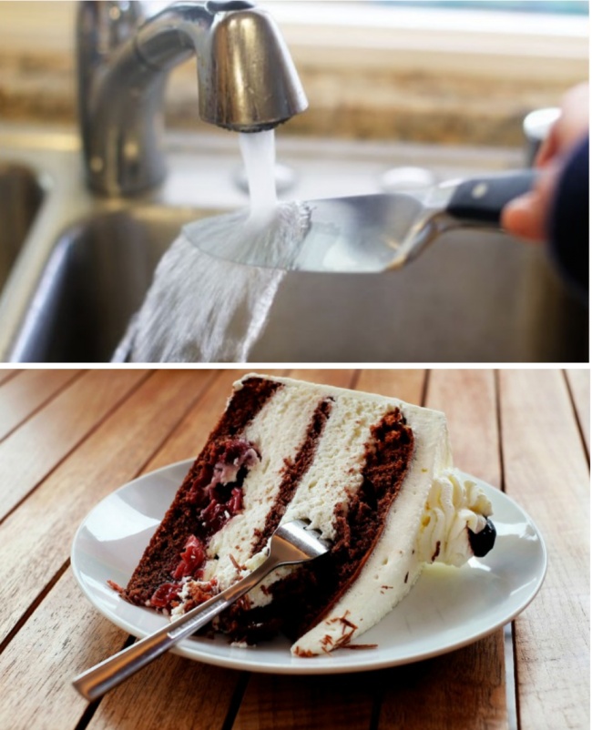 Щоб відрізати ідеальний шматок торта, потримайте ніж під гарячою водою. Тоді ножа не буде застрягати і прилипати до торту.