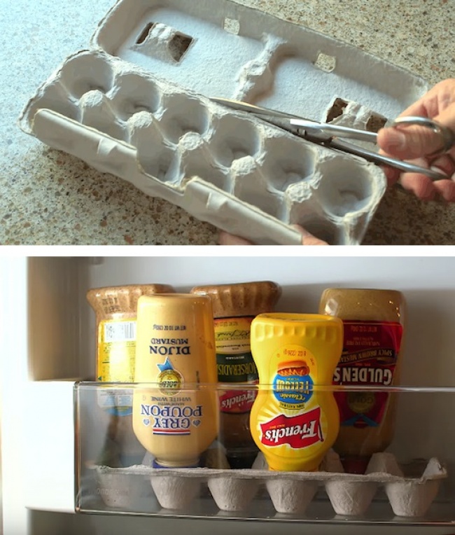 Зберігайте пляшки в перевернутому вигляді в коробці для яєць, щоб вміст випливало з них швидше. Крім того, пляшки не будуть кожен раз ковзати і падати у двері холодильника.