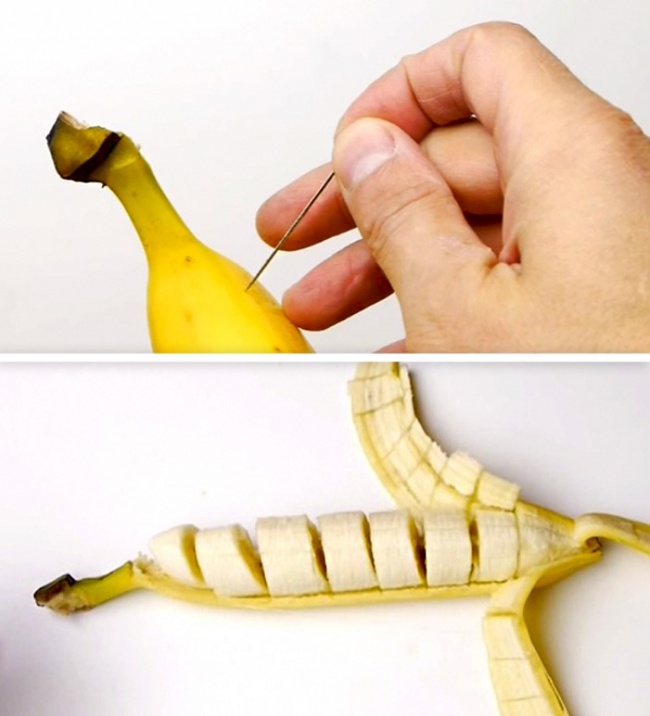 Створіть шматочки банана до того, як очистіть його, — здивуйте своїх друзів і дітей. Вставити голку у банан, поверніть вліво і вправо всередині банана. Вийміть голку і повторіть необхідну кількість разів. Коли ваш друг очистить банан, він буде вражений, виявивши, що той вже нарізаний.