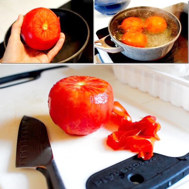 Зробіть X-подібний надріз внизу помідора і занурте його в киплячу воду на 10 секунд. Потім дістаньте і очистіть, коли овочі досить охолонуть.