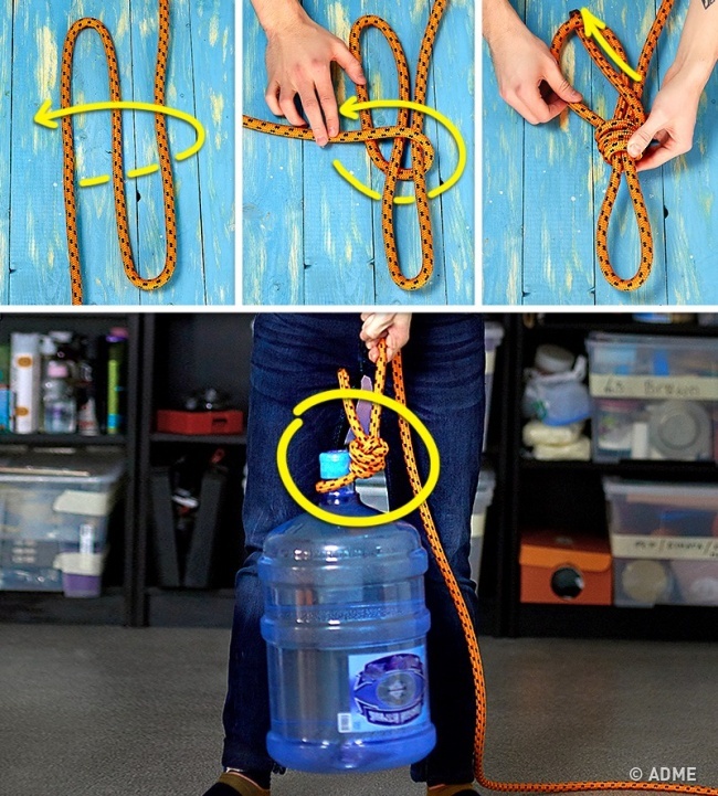 Де застосувати. Такий вузол часто використовується для підняття важких круглих предметів. Крім того, їм зручно піднімати кілька предметів відразу. Або використовувати замість ручки для відер, банок, бочок.