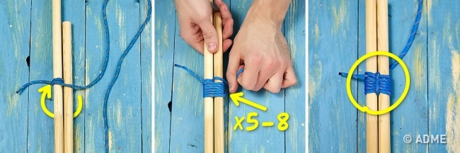 Як робити. Для початку робимо звичайний вузол на одній з планок. Потім прикладаємо до неї другу і робимо 5-8 обертів навколо. Залишилися кінцем стягаємо обв'язку, продевая його між жердин.