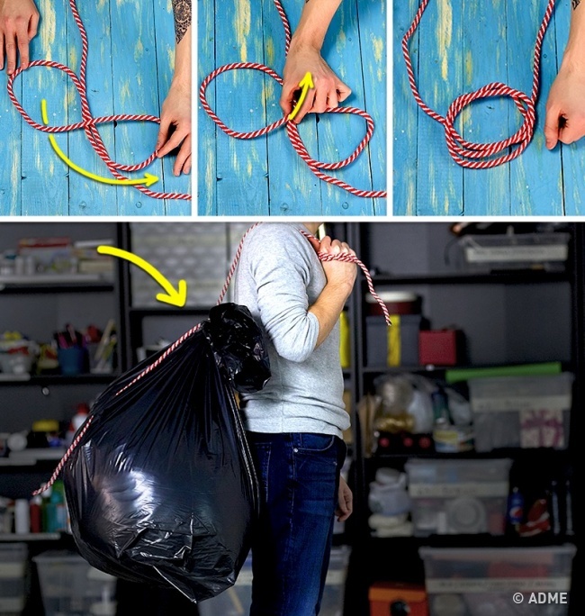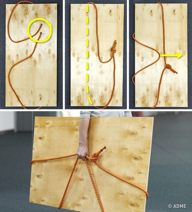 Як робити. Відміряйте мотузку такої довжини, щоб вона повністю огибала великий плоский предмет. Кінці мотузки зв'яжіть звичайним вузлом, а іншу частину перекиньте на іншу сторону, щоб мотузка була на 1/3 висоти предмета. Візьміть за середину мотузки з двох сторін і використовувати як ручку для перенесення.