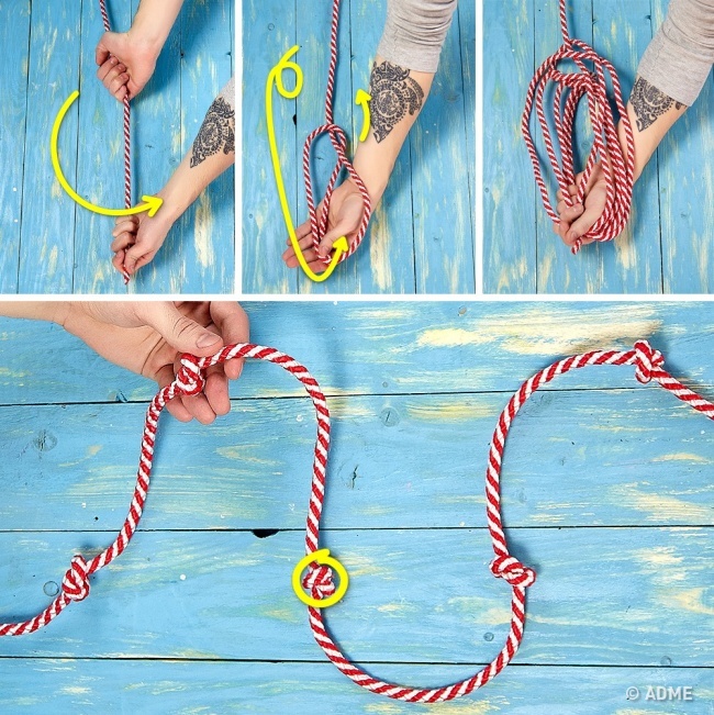 Як робити. По центру мотузки робимо петлю. Потім одну із сторін перевертаємо так, щоб мотузка була у формі вісімки. Тепер беремо за центр цієї вісімки (місце перетину) і просто складаємо петлі в готовий вузол.