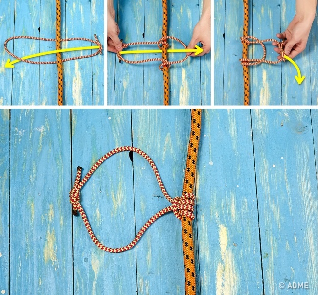 Як робити. Беремо край петлі з тонкої мотузки і робимо 3-4 витка навколо основної мотузки, при цьому пропускаючи кінець через петлю. Без навантаження цей вузол відмінно ковзає по мотузці і його можна легко пересувати рукою. Але якщо на вузол подається навантаження, то він затягується намертво і не зрушиться з місця.