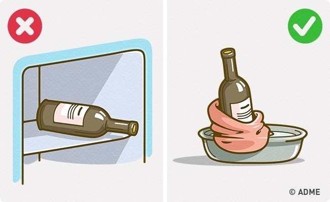 Просто оберніть пляшку рушником і покладіть її в ємність з холодною проточною водою. Бажано, щоб під час охолодження вода з крана безупинно текла на пляшку. Так рідина охолоне набагато швидше, ніж в холодильнику.